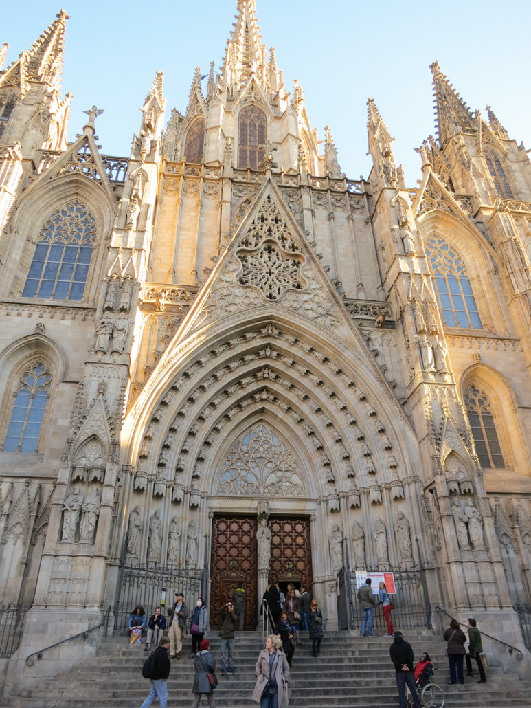 While researching Barcelona information online through TripAdvisor, we found Travel Bound, a company that provides free walking and biking tours around the city. We loved the sound of FREE. On our second day in the city, we went on their walking tour to get our bearings. We strolled through some of the central Barcelona neighborhoods learning the city’s history and fun facts – seeing the sights in Gothic Barrio, El Raval and La Rambla. We visited the Plaza del Rey where Christopher Columbus met with the Reyes Catolicos (Catholic Monarchs) Isabelle and Ferdinand who ended up funding his voyage to “discover” America. We also learned that Barcelona has a fascination with a caganer (a pooping man), which they add to their nativity scenes at Christmas time. Yes, it’s true – check out the Wikipedia article on caganer. Because we were visiting during the holiday season, the city was preparing all of its festive décor. Lastly, we visited a famous city square that has remembreants of Spanish Civil War (1936-1939). Although there is a “gag order” in Spain preventing them from building monuments to honor those lost during this war, this particular city square has a small plaque above the site where a bomb had exploded, and the damage from the bomb was left intact as a type of memorial.