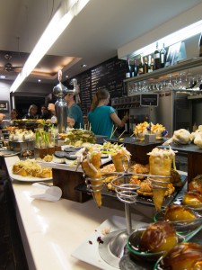San Sebastián is known to be the culinary mecca of Spain, and we enjoyed every moment of our time here. Only 12 miles from the French border, San Sebastián (or Donastia, as it is known in the local Basque dialect) was the perfect place to spend a month surfing and eating. We never had a shortage of delicious Basque, Spanish or French food, but you can imagine how our clothes fit after a month of living around the corner from hundreds of restaurants serving delicious food and wine. Our apartment was conveniently located across the street from the surfing beach and in the Parte Vieja (Old Town) where there are hundreds of pintxos bars in a square mile vicinity. (Pintxos is Basque for tapas, and they are delicious bite-sized appetizers that are traditionally served at bars.) To control our weight gain and budget, we tried to limit ourselves to going out 2 nights per week and the cooking at home for the rest of our meals. Needless to say, that was a very difficult goal to achieve. To give you an idea of what we were up against, here is some further reading on San Sebastián’s pinxto bars.